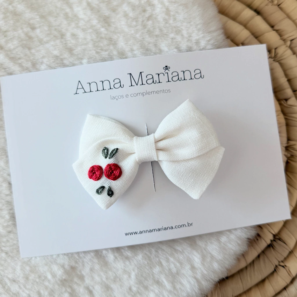 Laço Clarinha confeccionado no linho off-white e com delicadado bordado feito à mão florall! Disponível na faixinha nude ou clip bico de pato semi forrado!