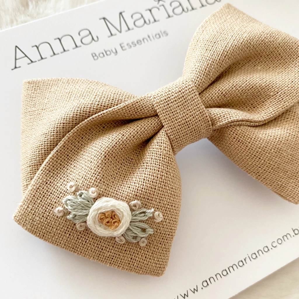 Laço Clarinha Maxi confeccionado na cambraia de linho e com bordado floral! Disponível na faixinha nude ou clip bico de pato semi forrado!