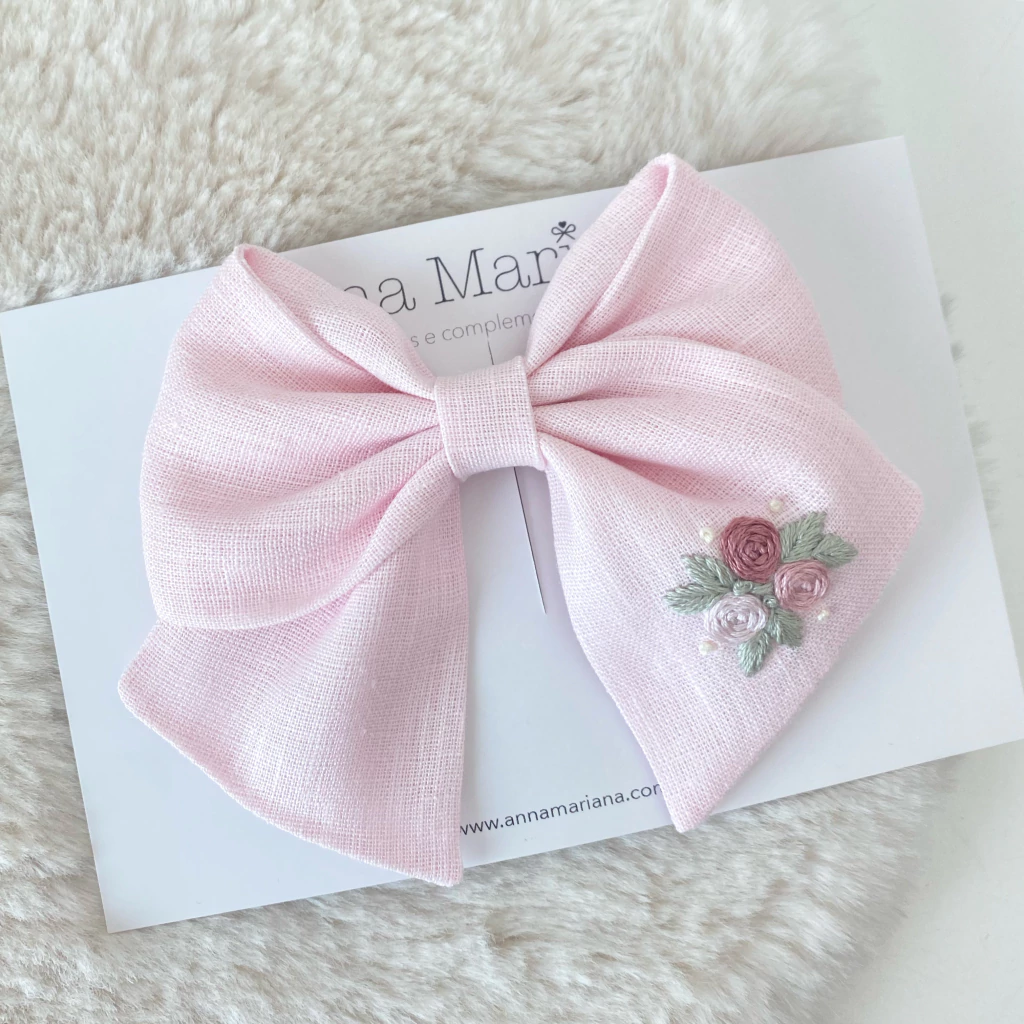 Laço Emma confeccionado com linho puro e bordado à mão! Disponível clip bico de pato semi forrado!